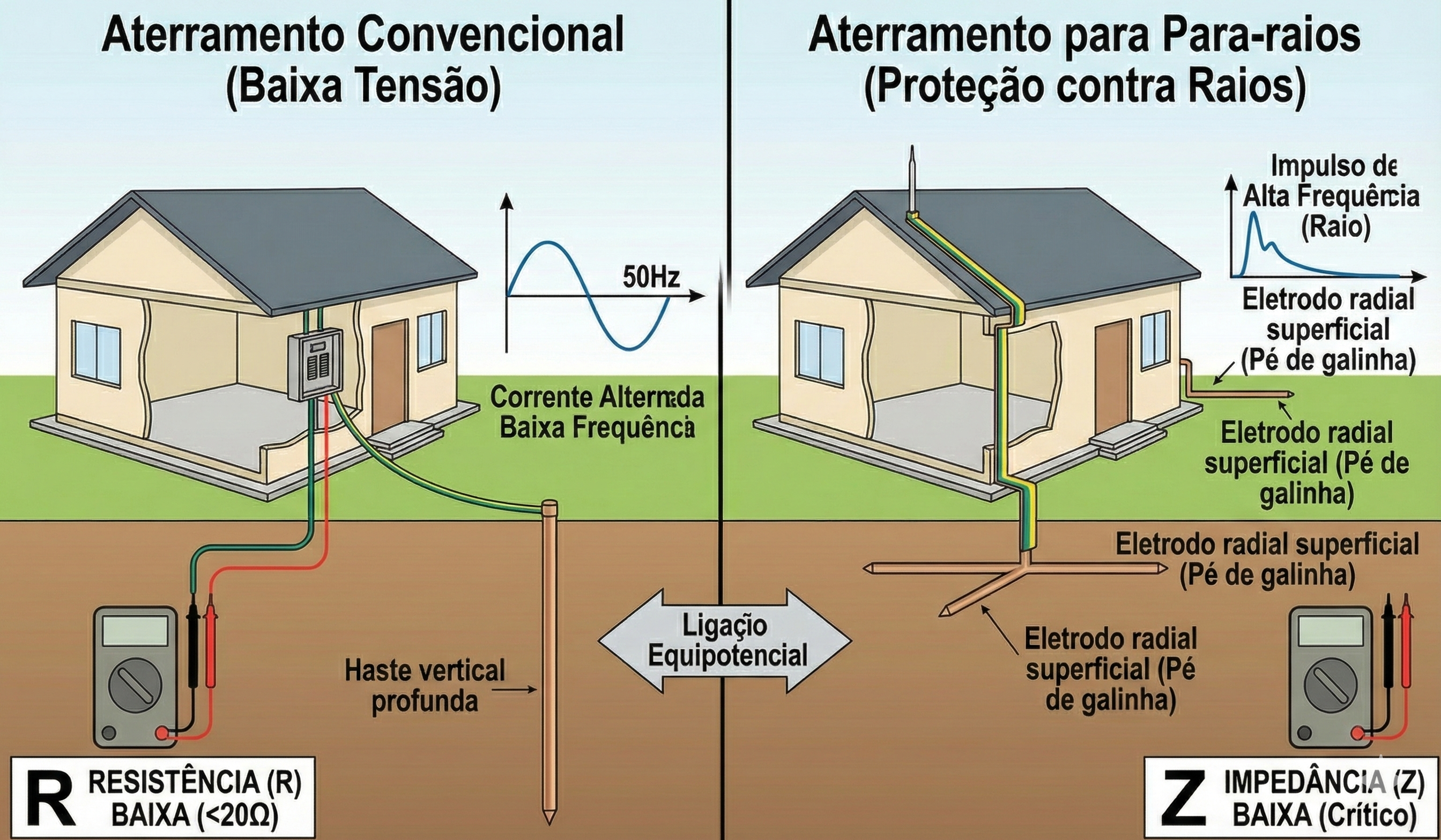 Exemplo típico: Um único eletrodo vertical de 3 metros pode medir 5 ohmios (valor baixo de resistência), mas seu comportamento diante de um impulso de alta frequência pode ser ineficiente, obrigando a corrente a buscar caminhos alternativos perigosos.